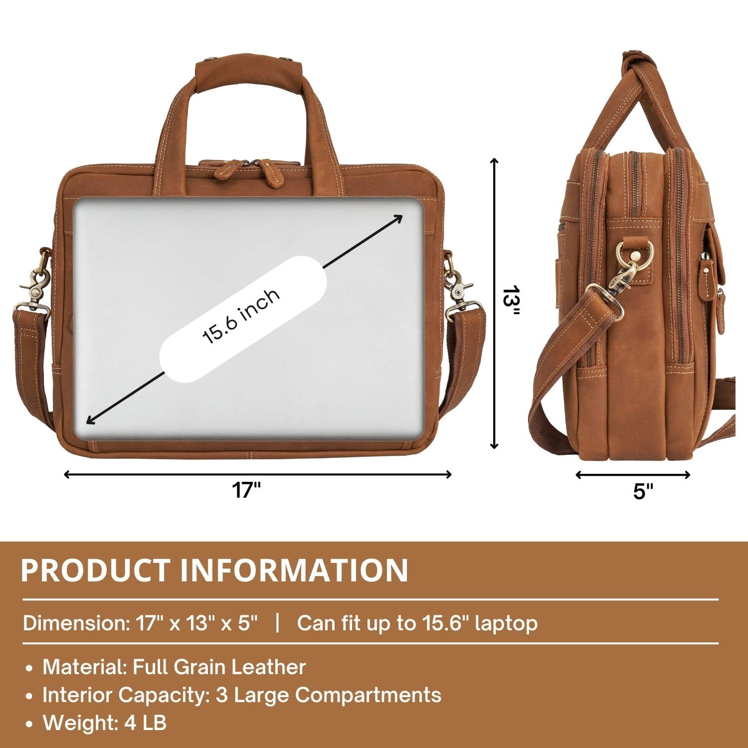 - PRODUCT SPECS - The briefcase contains many compartments with extensive interior organization, adjustable strap with cushioned shoulder pad, luggage strap for airport use, hooking system for wires, and a padded laptop compartment. Dimensions: 17.75" (W) x 13" (H) x 5" (D)